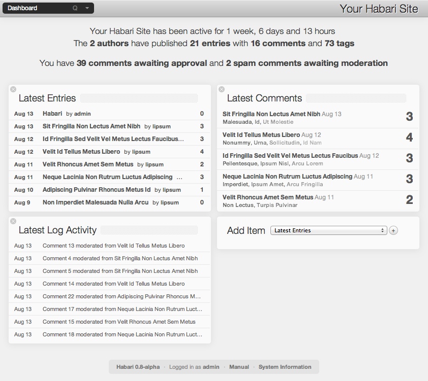 The Dashboard is the first page you see after you log in to Habari's administrative interface. The dashboard can be reached from any page of Habari's administrative interface by choosing Dashboard from the main menu, or by typing Q followed by D.