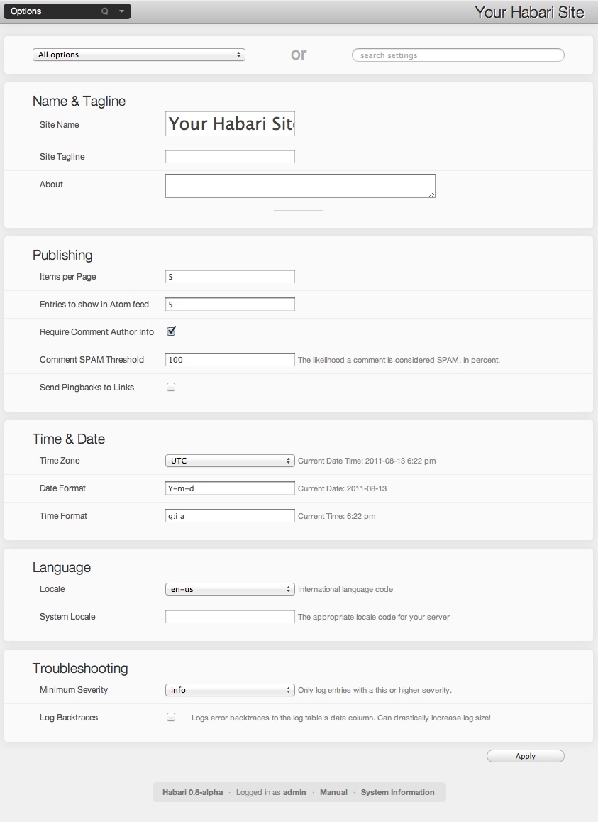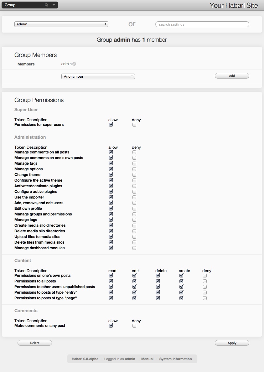 Habari supports multiple users, each of which can be assigned to groups with different permissions within the system. Some users can have phenomenal cosmic powers (over the blog, that is) while some users can be restricted to simply writing new posts depending on their groups.