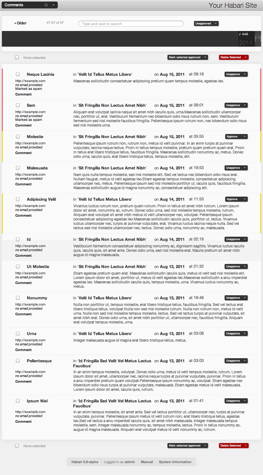 In the top center of the Comments page is the search box. You can use this box to type in search terms to find comments. To find all comments that include the word Habari, simply type Habari into the search box and wait a moment. The list of comments will be updated, and the quantity indicator to the left of the search box will be updated. Beside the search box are several links that provide shortcut filter controls to the different statuses and types a comment may have. To see only Approved comments, click the Approved link: this will add status:Approved to the search box, restricting the list of comments to only those which are approved. Click the Approved link again to remove that filter from the list. Using these, you can quickly drill down to see all your comments. Click the Unapproved link and the Pingback link to see all your unapproved pingbacks. Click the Unapproved link again to remove the Unapproved filter and see all pingbacks, regardless of status.