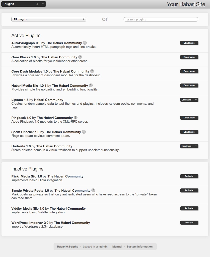 The plugins page is divided into two main sections. At the top of the page is a list of the plugins you have activated. The bottom of the page contains a list of the plugins you have installed, but have not yet activated. Even if you have not added any plugins yourself, this section will contain the plugins that come with Habari.