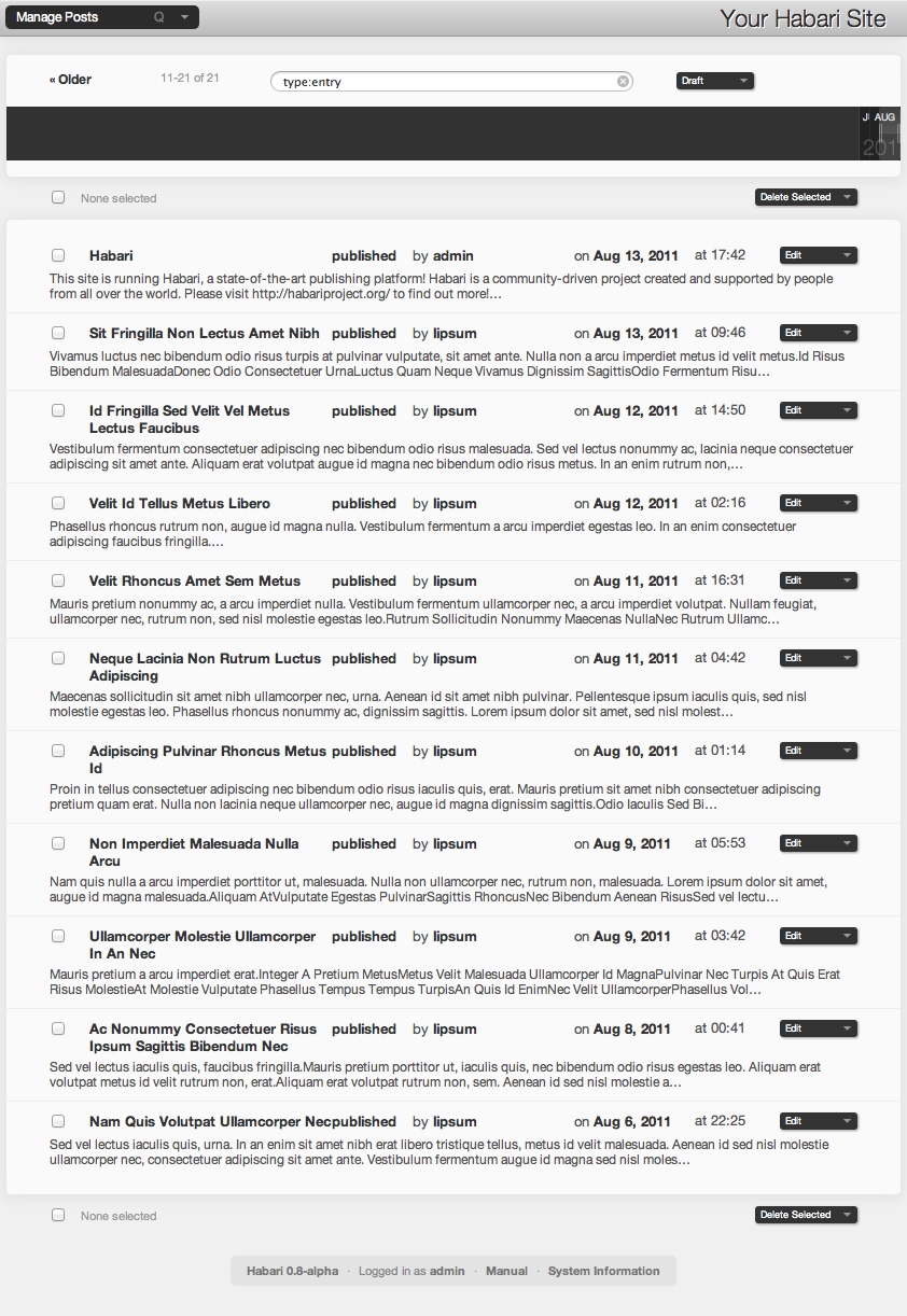 Habari strives to make it as easy as possible to find and manage your content. The first thing to note when visiting the "Manage Content" page is the timeline.