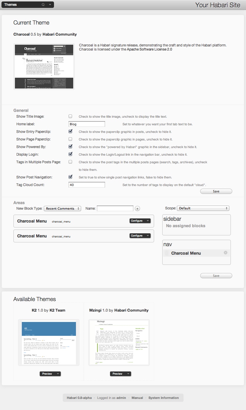 Your site's theme is its basic look and feel as seen by your visitors. Habari includes two themes.
